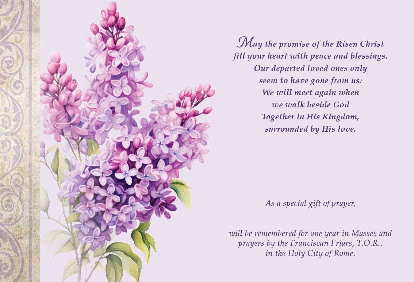 Send this Sympathy Card to anyone mourning the loss of a loved one. The beloved deceased will be remembered in Masses and prayers in the Holy City of Rome for one full year.