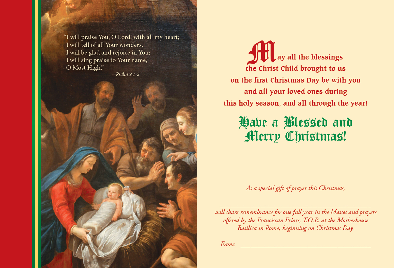 Among the most popular of all our greeting cards are our stunning Christmas cards—including this unique Madonna & Child design. Each recipient of our Madonna & Child Card will be remembered for one year in the Masses of the Franciscan Friars, T.O.R., in Rome.