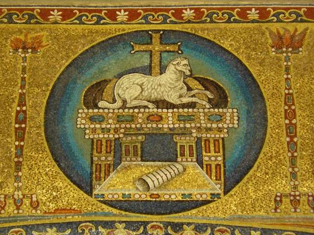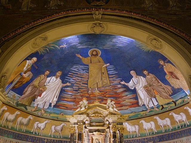 This mosaic dates from 527-530 AD. The dominating figure in the center is that of Christ the Judge, who stands above the dramatically colored clouds, clothed in a clasped toga and a stole signifying a learned man. To approach Christ, it is necessary to cross the Jordan River, symbol of Baptism and life giving grace. The Apostle Peter presents Cosmas and the Apostle Paul presents Damian so that they may receive the crown of their martyrdom.